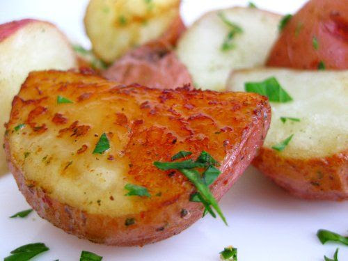 Parmesan Roasted Potatoes -- Thanks to: Andie Mitchell / Stay for Dinner INGREDIENTS: 12 small red skinned potatoes (roughly the size of plums); 2 Tbsp. olive oil; 2 tsp. garlic powder; ½ tsp. onion powder; ¾ tsp. salt; ½ tsp. freshly cracked black pepper; 2 Tbsp. Parmesan cheese